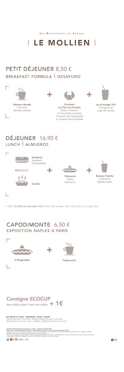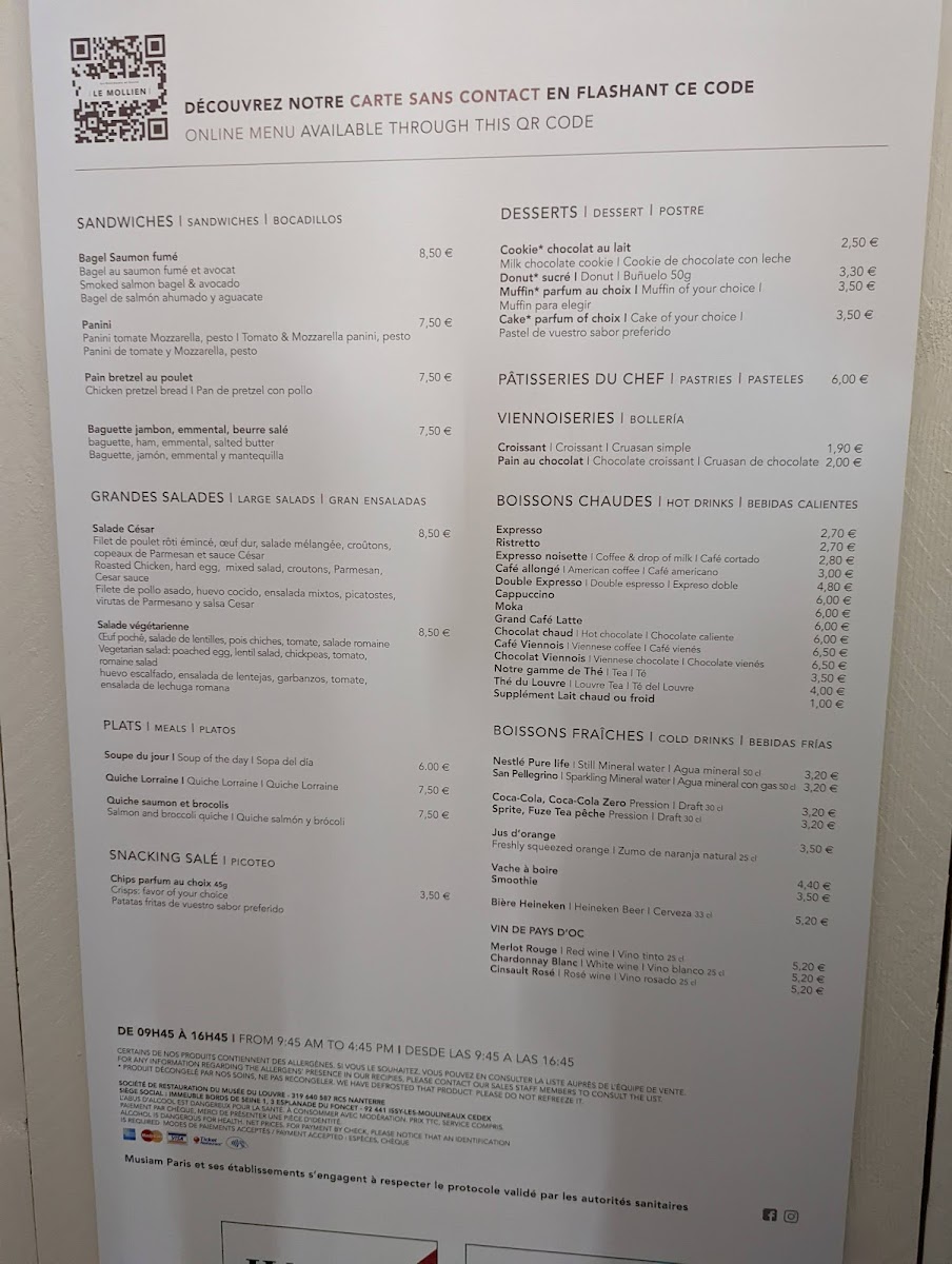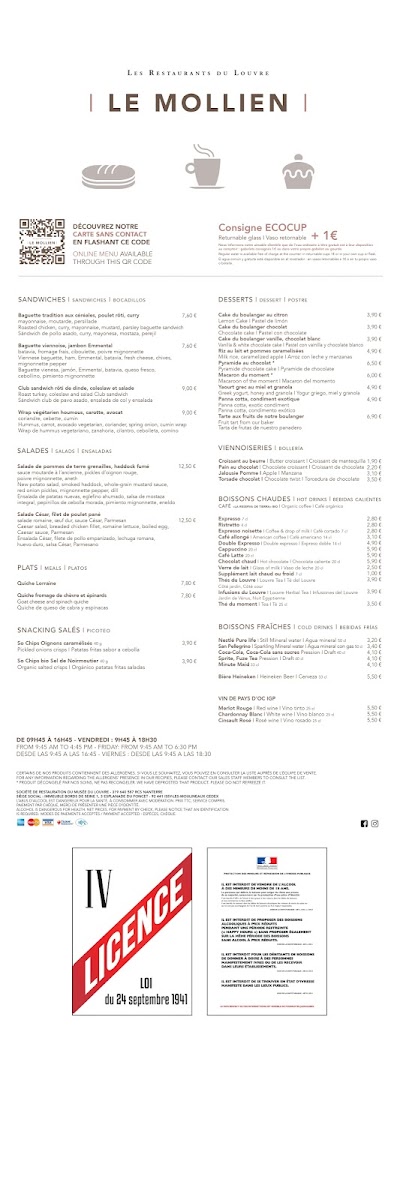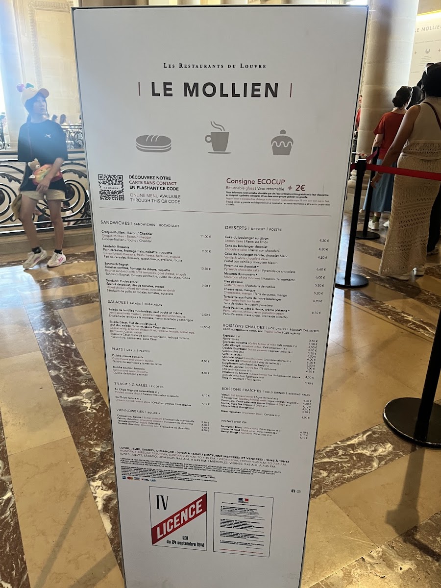 Welcome to Cafe Mollien, a delightful spot nestled within the Louvre in Paris, perfect for a rejuvenating break amid your art exploration. Customers frequently rave about its scenic balcony views overlooking the iconic Louvre pyramid, creating a serene and relaxed atmosphere. Here, you can indulge in simple yet satisfying fare, such as the popular quiche Lorraine and a selection of sandwiches including a notable eggplant option. Desserts like the chocolate pyramid bombe often steal the spotlight, as patrons describe them as heavenly. While the café can get quite crowded, the friendly staff work diligently to provide a memorable experience. Although it leans more towards a casual snack bar than a fine dining establishment, Cafe Mollien beautifully combines convenience with delightful flavors, making it an essential stop for anyone visiting the Louvre.